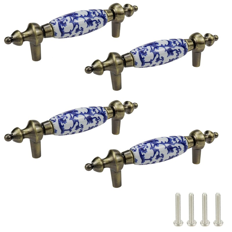 - [Feature]The cabinet handles use of bronze zinc alloy base, with classical printing of Blue ceramic handle, beautiful and advanced, suitable for retro, rustic, American, European, court style, Chinese style furniture decoration