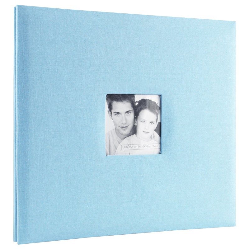 - Light Blue fabric cover measuring 13.5x12.5"es with a photo opening