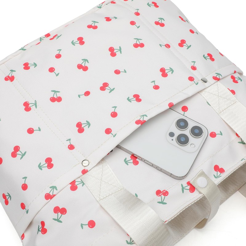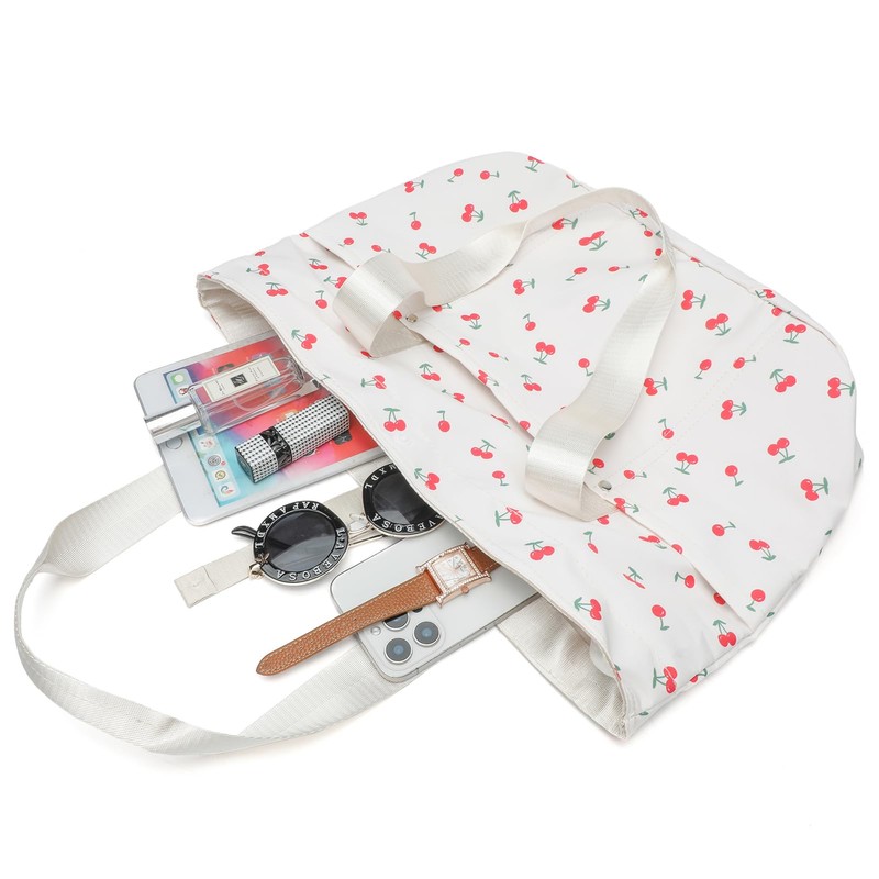 mcuvaec Foldable Floral Tote Bag for Women Nylon Travel Handbag with Zipper Cherry Print Purse Daily Commuter Bag for Work (cherry white)