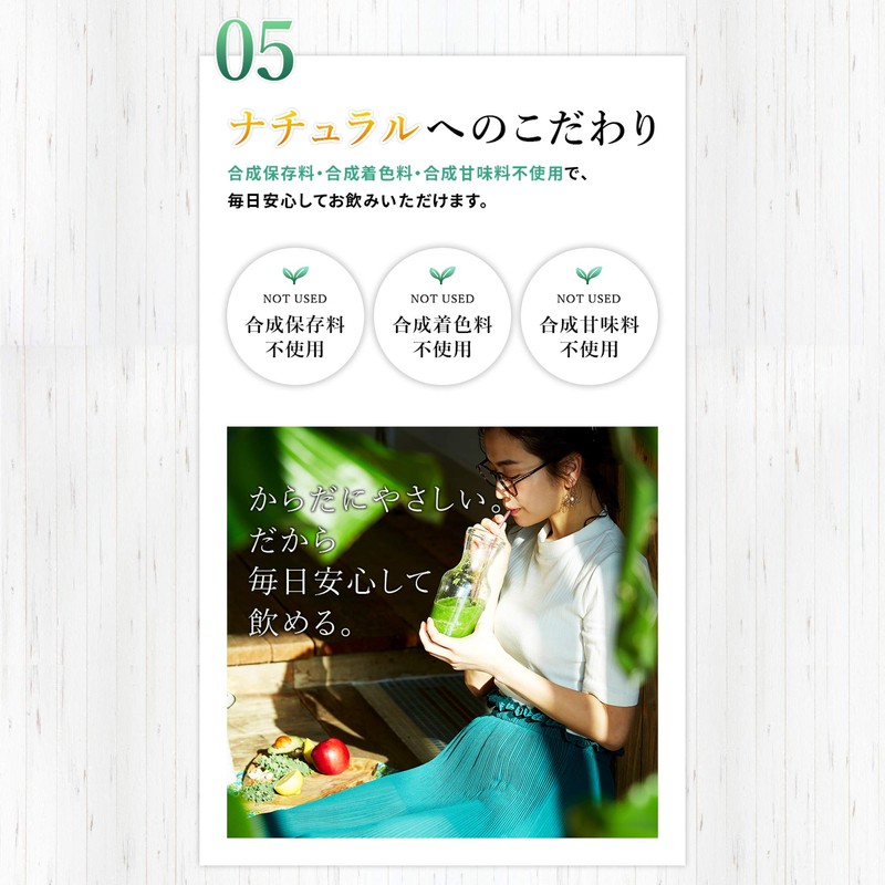 - 【「ナチュラル」にこだわったスムージー】「自然のチカラで内側から美しく。」をキーワードに美容・健康をサポートするブランドとして誕生しました。大地の力を借りて育った自然派素材にこだわり、合成保存料・合成着色料・合成甘味料不使用。
