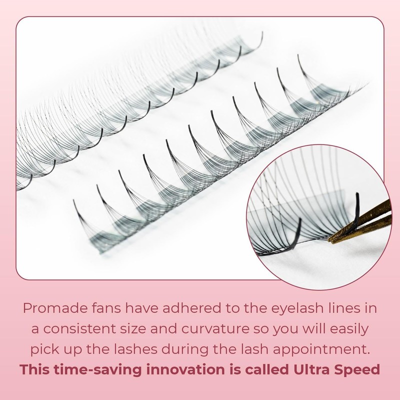 - Ultra Speed Eyelash Extensions: Our Ultra Speed Promade Eyelash Extensions are adhered to the eyelash lines in a consistent size and curvature so you will easily pick up the lashes during the lash appointment. This time-saving innovation is called Ultra Speed.