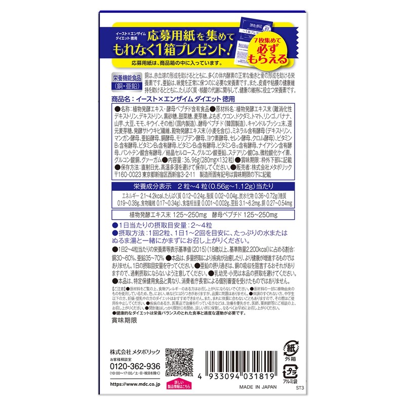 MDCメタボリック イースト×エンザイム ダイエット (132粒) 和漢発酵すっきりサプリ 栄養機能食品 (活きてる酵素 × 酵母ペプチド)