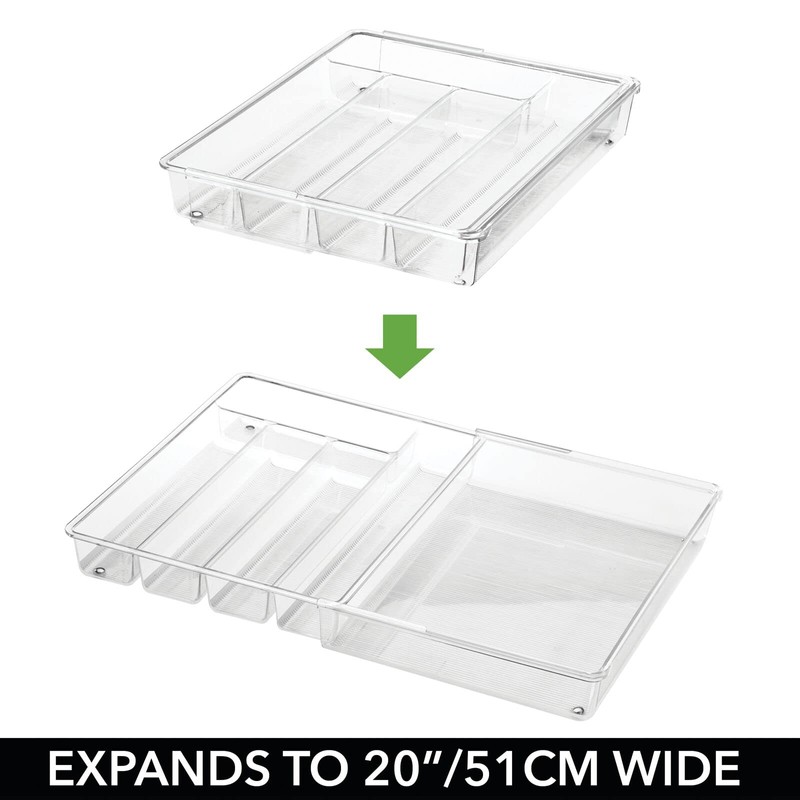 - EXPANDABLE: Customize to fit your drawers by expanding the tray for a perfect fit; No hardware needed, it is easy to use - just slide to the width you need; Drawer Organizer bins make it easy to organize small or crowded kitchen spaces and keep clutter away; Works well on counter, in cabinets, pantry, and more; Great for small spaces - homes, apartments, condos, college dorm rooms, RVs, and campers.