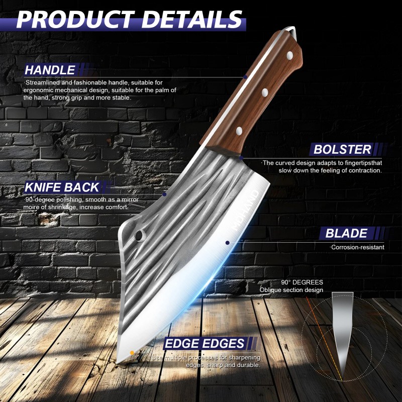 • 【14-in-1 Multifunctional Butcher Knife Set】: The MDHAND set contains 7 knives to meet a variety of kitchen needs. The set includes a Serbia chef's, a cleaver, a Viking knife, two boning knives, a skinning knife, and a multi-purpose knife. In addition, there are 7 sheaths to ensure the safety of each knife. Knife accessories include sharpening bars, finger guards and bottle openers to provide comprehensive support for your kitchen. All knives and accessories can be neatly stored in rolled-up cloth bags for easy carrying and storage.