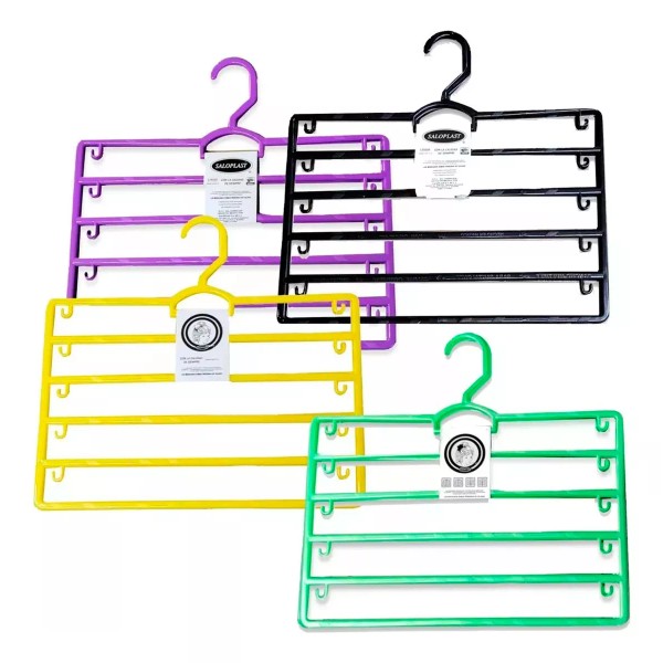 Kit de 3 ganchos de plástico de calidad de colores para pantalones. Caben hasta 4 pantalones en el mismo gancho. Son ideales para ahorra espacio en tu clóset. Dale un toque elegante a tu clóset con estos prácticos ganchos.
