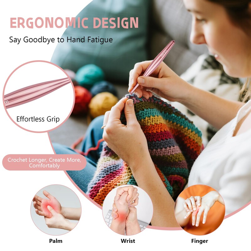 - Premium Solid Aluminum Crochet Hook: Crafted from premium solid aluminum,each crochet hooks boasts a polished,ultra-smooth surface,allowing yarn to effortlessly glide without snags or drag.The ergonomic design provides a comfortable grip,reducing hand strain,ensuring hours of effortless crocheting without hand fatigue.