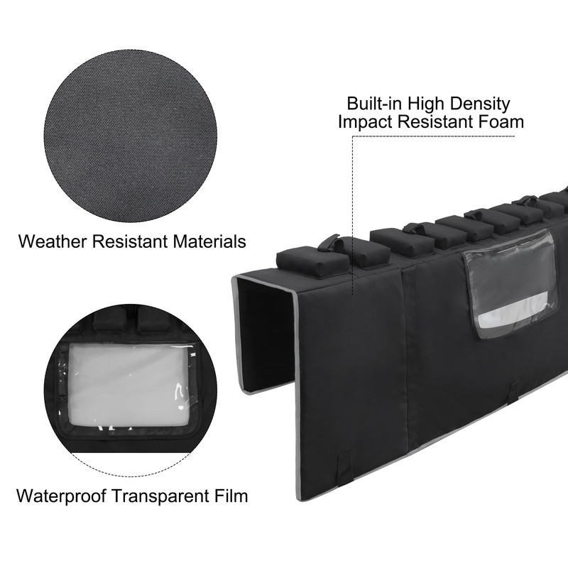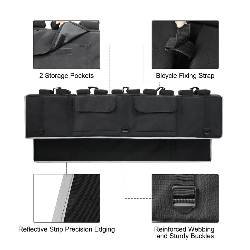 - 【Practical Design】- Two flip-top tool bags can provide rain protection and prevent tools from being lost during driving, and the large-capacity pockets can make the bike mat more suitable for storing tools when going out. The rear opening window design allows easy and unobstructed access to the tailgate handle and rearview camera. Our Tailgate Bike Pad has been upgraded with a visible rear opening window. When reversing on a daily basis, reversing is safe and unobstructed