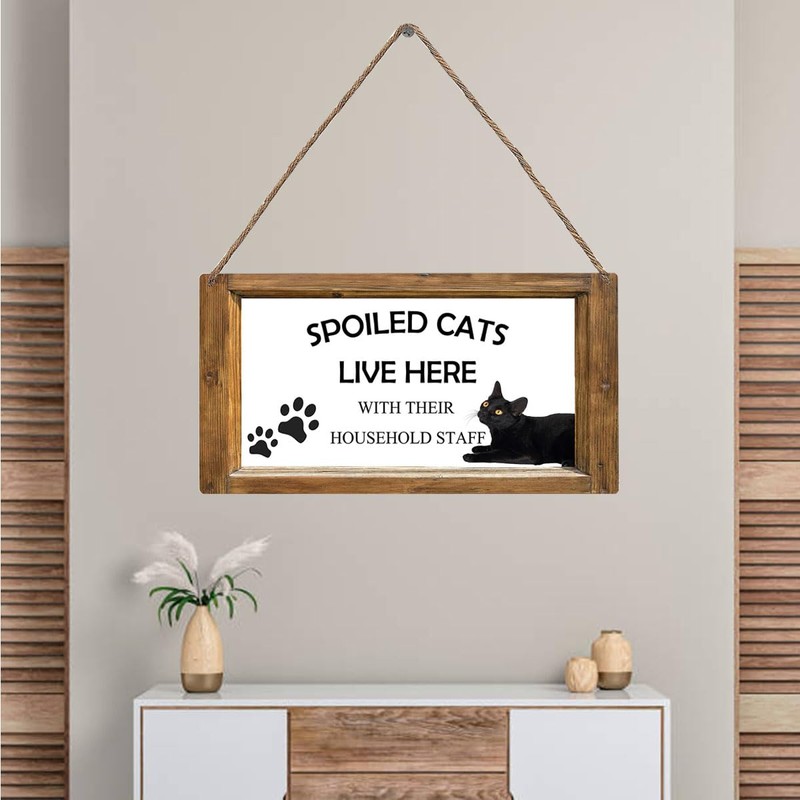Mdulftar Cute Black Cat Welcome Door Sign Spoiled Cats And Their Staff Live Here Front Door Hanger Sign 12" x 6" Farmhouse Rustic Wooden Hanging Sign Home Porch Window Decor