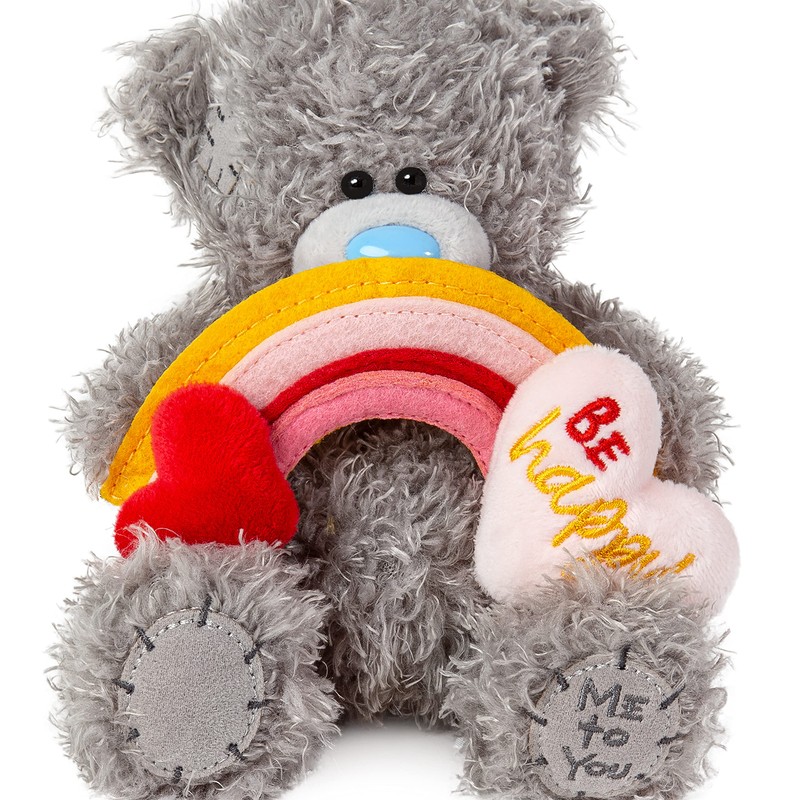 - ADORABLE TATTY TEDDY BEAR - the iconic blue nose bear is holding a colourful rainbow with the message 'Be Happy' embroidered on a heart; the perfect sentiment for someone you really care about