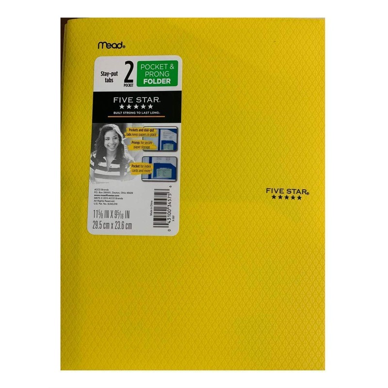 Mead Plastic Five Star Stay-Put 2-Pocket & 3-Prong Folder, Yellow (34609)