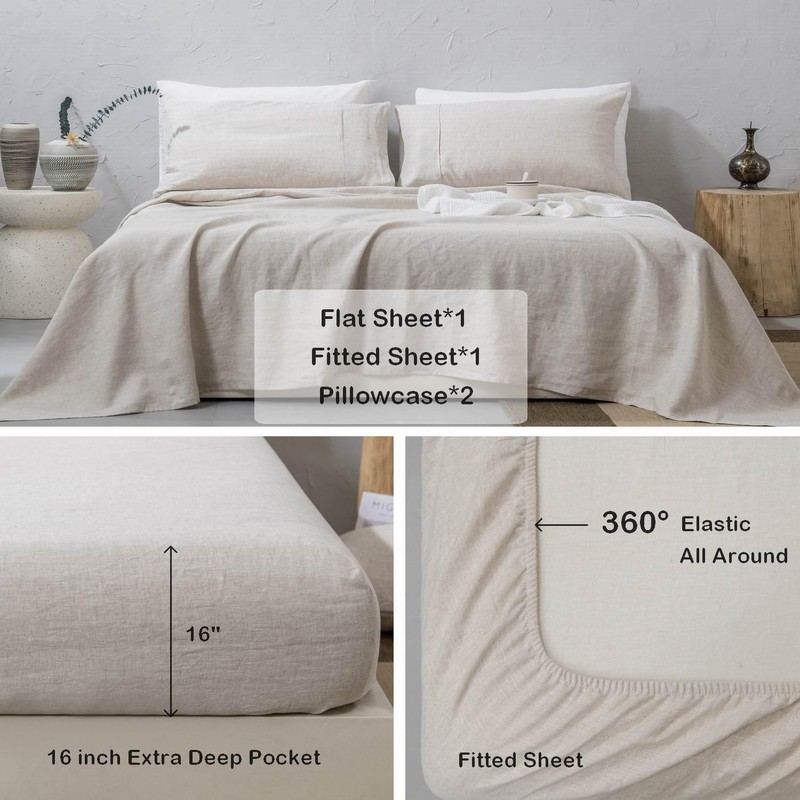 meadow park 100% Washed French Linen Sheet Set-Queen Size-Natural Linen-4 Pieces (1 Flat Sheet, 1 Fitted Sheet & 2 Pillowcases), 16" Deep Pocket, Breathable,Ultra Soft and Durable