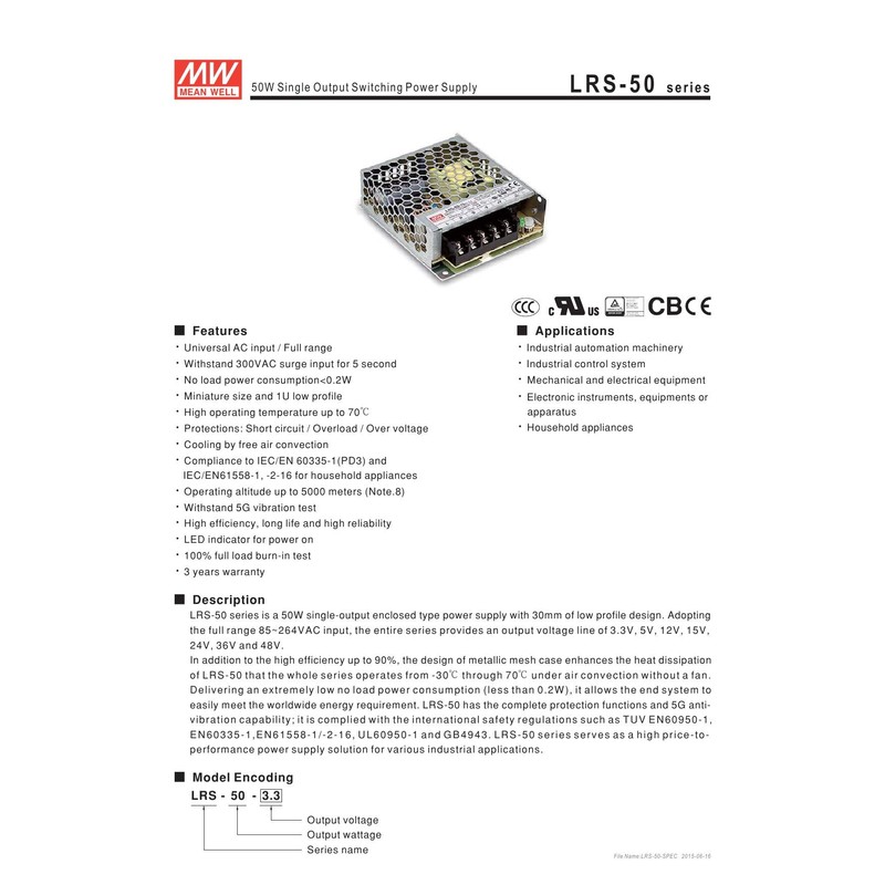 Mean Well LRS-50-12 Switching Power Supply, Single Output, 12V, 4.2A, 50.4W, ...