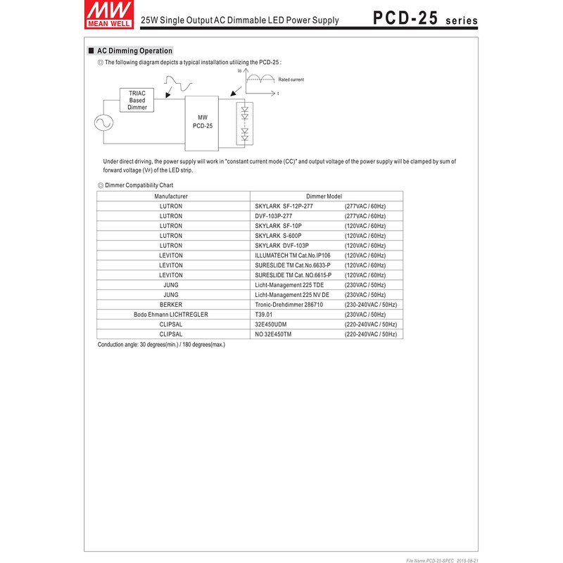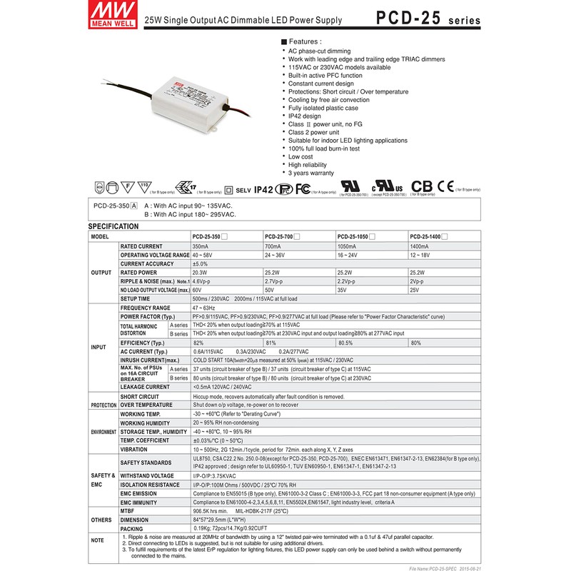 MEAN WELL PCD-25-1400A PCD Series 25 W 1.4 A 18 V Phase Dimmable Driver (North American Version) - 1 item(s)
