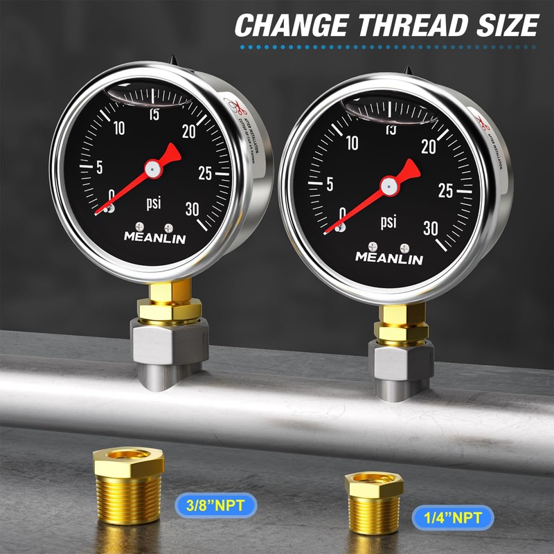 MEANLIN MEASURE 0~30Psi Stainless Steel 1/8" NPT 1.5" FACE DIAL, Glycerin Filled Pressure Gauge, Liquid Filled, Lower Mount(Black) with 1/8" x 1/4" NPT and 1/8" x 3/8" NPT Hex Bushing