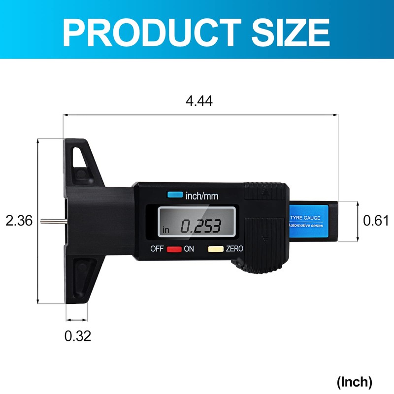 2.Digital tire tread depth gauges are designed to measure the depth of tire grooves. This gauge is designed for use with all types of tires and is simple to use. The device has a plastic grip handle which provides a comfortable and secure grip. It is lightweight and easy to use. It is also resistant to dust, water, and other environmental factors. The Digital Tire Tread Depth Gauge is great for checking tire wear, ensuring vehicle safety, and ensuring compliance with relevant legal requirements.