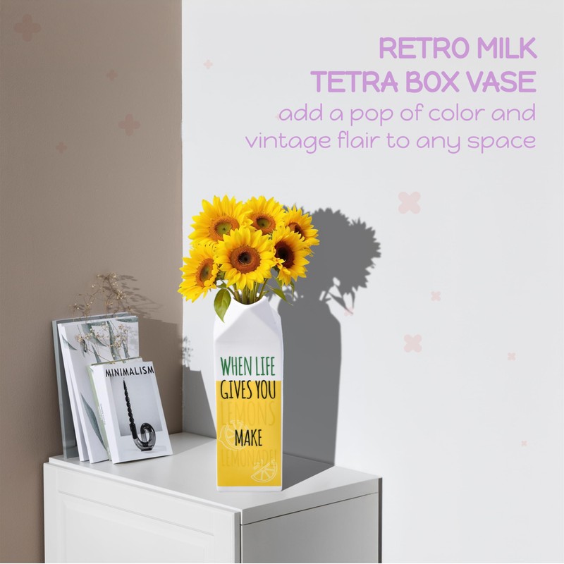 - UNIQUE TETRA PACK DESIGN: Embrace your quirky side with this weird vase that takes inspiration from a retro lemon juice box. This funky vase is sure to capture attention and spark conversations
