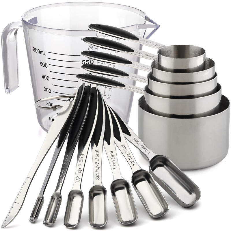 • Measure Set Sizes:5 measuring cups(1 cup,1/2 cup,1/3 cup,1/4 cup,1/8 cup);7 measuring spoons(1/8 tsp, 1/4 tsp, 1/2 tsp, 3/4 tsp, 1 tbsp, 1/2 tbsp, 1 Tbsp) ,1 leveler and 1 plastic measuring cup(600ml).Meet your various needs for cooking and baking.
