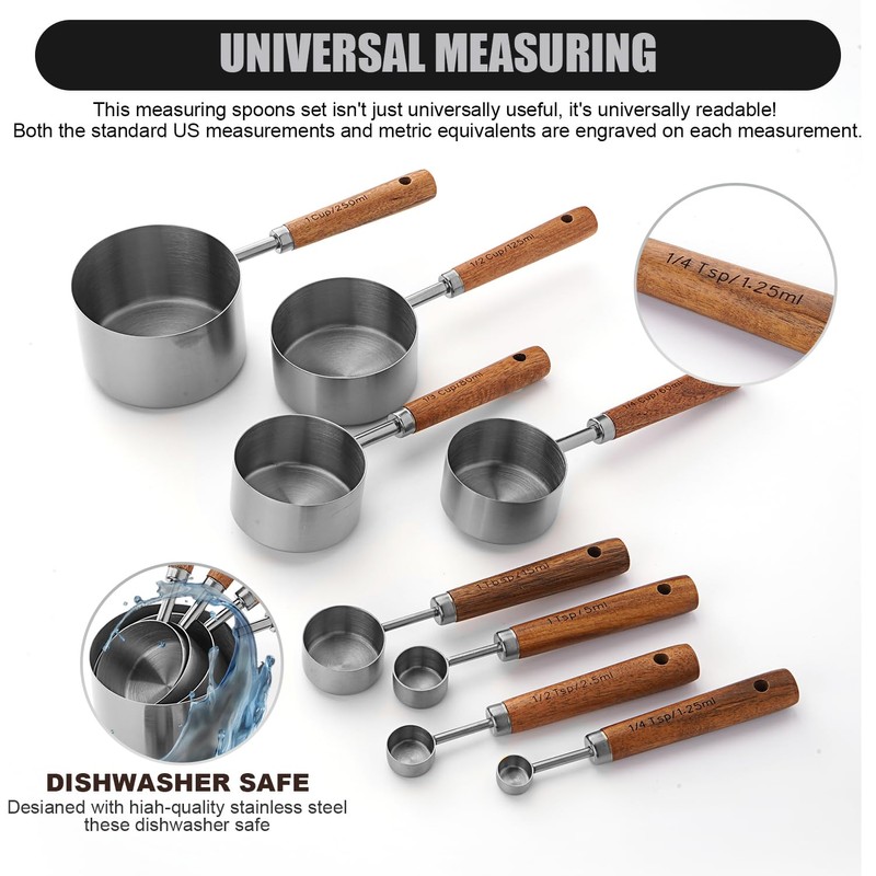 - Elegant Design: Our measuring cups and spoons set has a modern and retro style,the natural wood handles add a touch of sophistication, it is not only functional but also a piece of artwork. This set adds class and style to any kitchen, making it the perfect addition to your kitchen decor.
