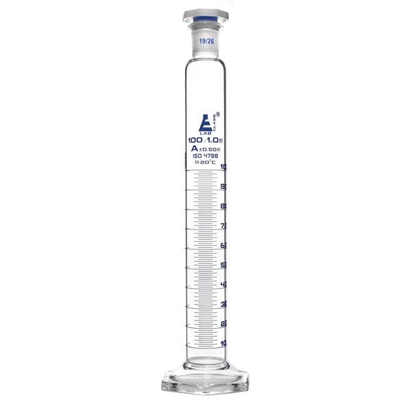 Measuring Cylinder, 100ml - Class Tolerance ±0.50ml - 19/26 Polypropylene Stopper - Hexagonal Base, Blue Graduations - Borosilicate Glass - Eisco Labs