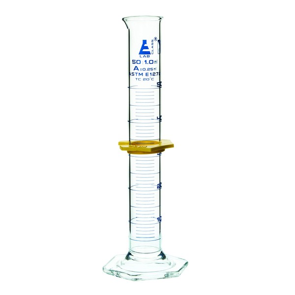 Measuring Cylinder, 50ml - ASTM, Class A Tolerance ±0.25ml - Protective Collar, Hexagonal Base - Blue Graduations - Borosilicate 3.3 Glass - Eisco Labs