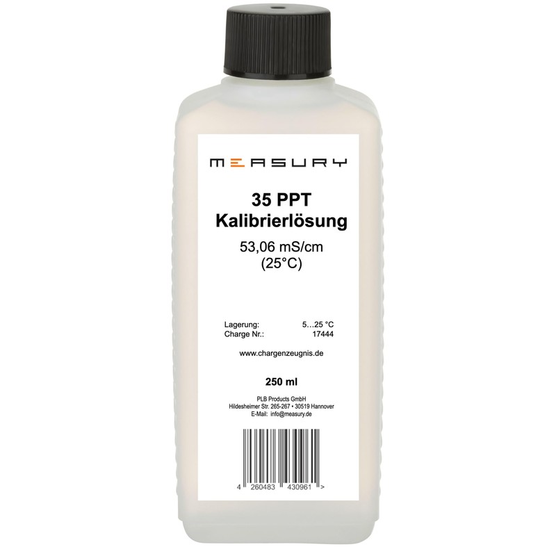 - No mixing required – the 35 PPT calibration solution is ready to use and does not need to be mixed with distilled water, as is the case with calibration powders. We recommend tilting the solution into a separate glass for calibration and then not returning it to the bottle to avoid contamination.