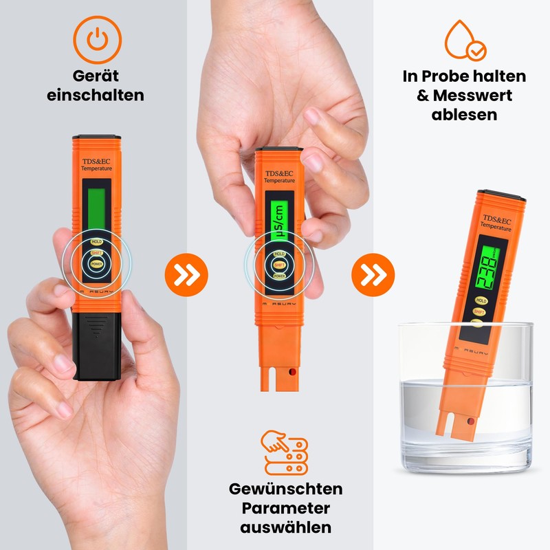 - Display of the measurement as TDS and EC value – so no tedious conversion by hand is necessary.