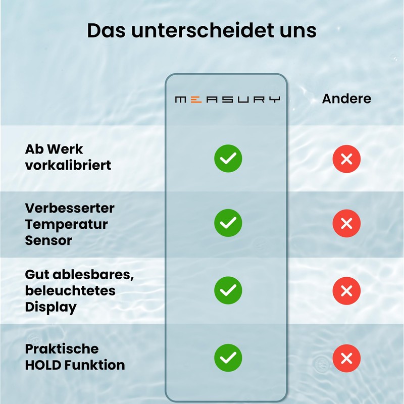 The lower the TDS value, the purer the water is. The MEASURY TDS & EC meter is therefore ideal for measuring the quality of your drinking water or to check whether it is time to change the filter of your osmosis system.-
