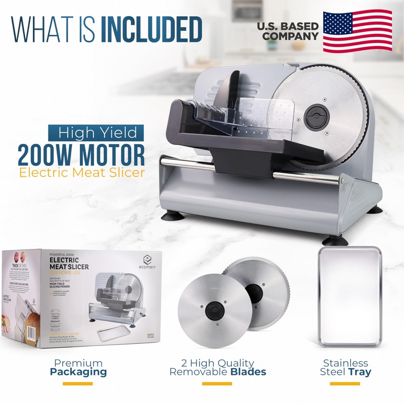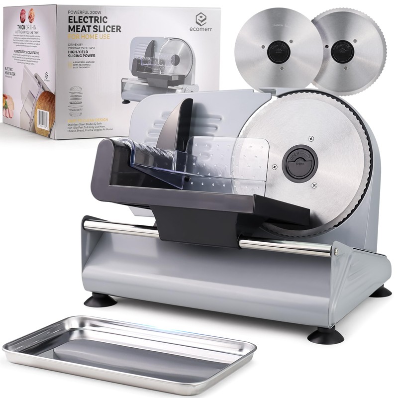 - Perfectly Sliced Meat - Cut up ham, bacon, deli, or salami like a pro. Our 200 Watt meat slicers for home use comes with 2 round stainless-steel blades that lets you cut meat and food quickly and safely.