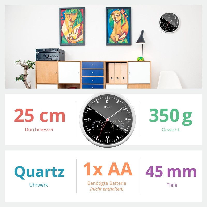Mebus Quartz Wall Clock with Thermometer and Hygrometer/Silver Frame/Black Dial/25 cm Diameter/Round/Model: 56731/Colour: Silver, Black