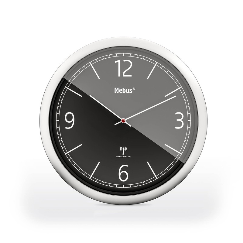 Mebus Radio Controlled Wall Clock 26cm Silent Clear Design Silver Frame Black Dial Model 19813 - Modern and Precise
