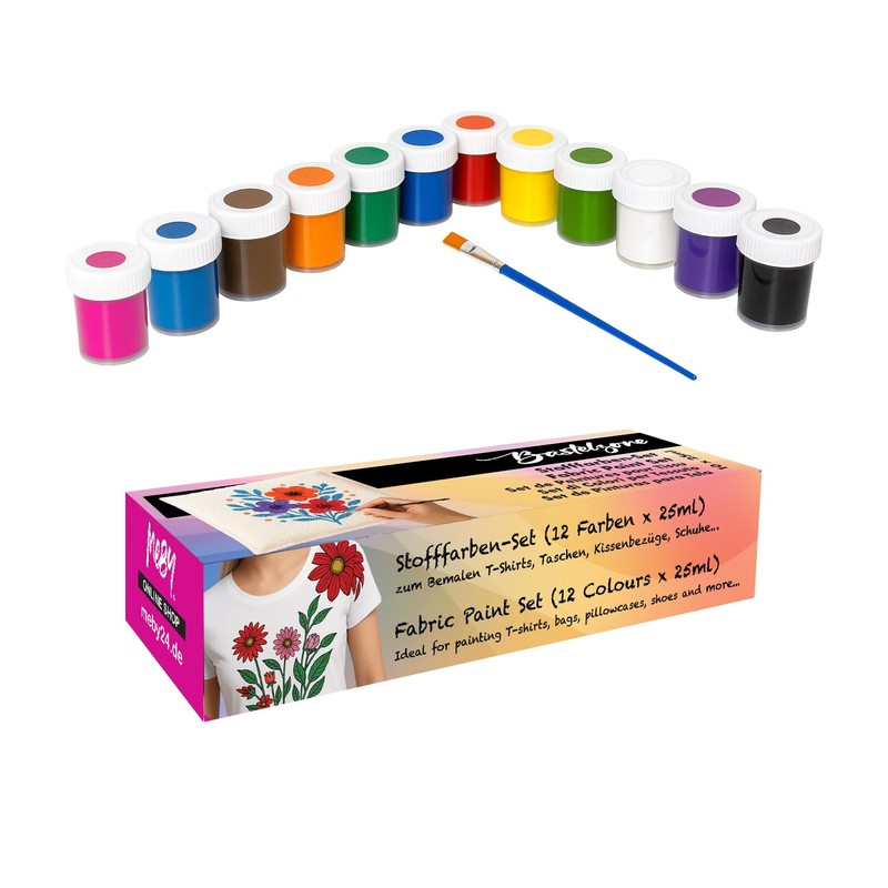 MEBY Textile Paints - Fabric Paint Set with Brush, Washable & Bright Textile Paints for Children & Adults, Ideal for T-Shirts, Bags & Fabrics (12 Colours x 25 ml)