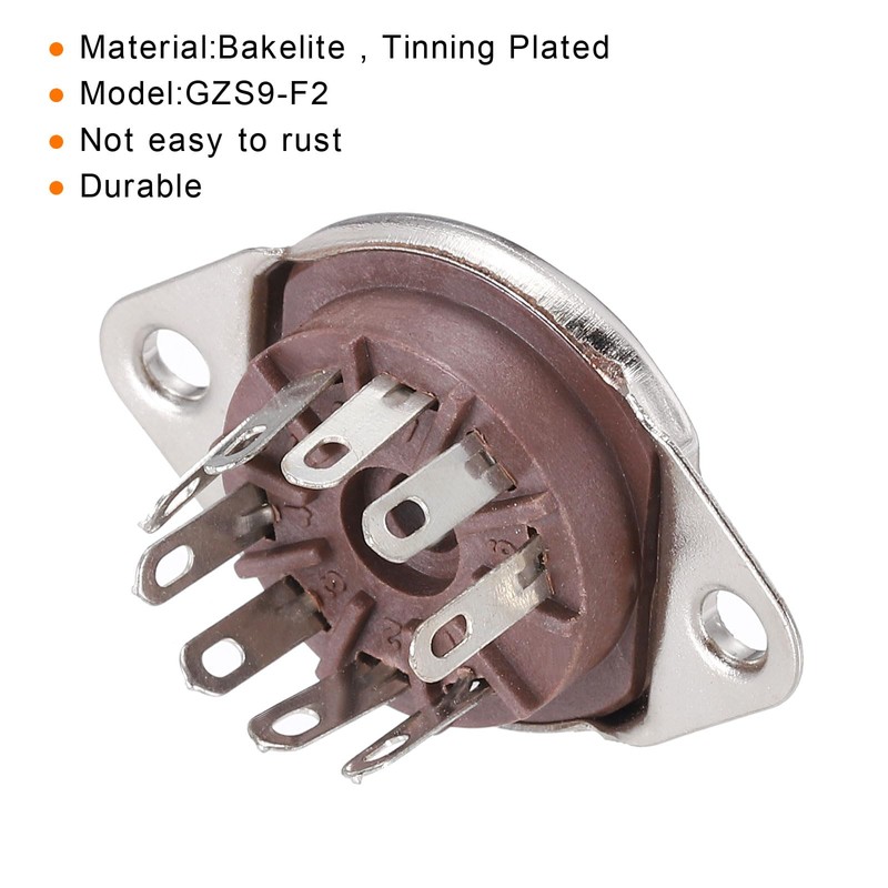 Color:Khaki;Model: GZS9-F2;Terminal: 9 pins;Material: plastic , Tinning Plated;Size:23x9.5x16.5mm/0.91x0.37x0.65 Inch(W*H*total H);Outside diameter:35.5mm/1.4 Inch;Installation hole spacing: 28mm/1.1 inch;Panel opening diameter:18mm/0.71 Inch;Pack of 10 Tube Socket;Suitable for KT66 KT88 6SL7 6SN7 6V6 5AR4/GZ34 5R4GY 5U4G 6AS7G 6B4G 6BL7GT 6F6 6J5 6J7 6L6 6SJ7 274B 348A 350B 421A 5691 etc. tube;