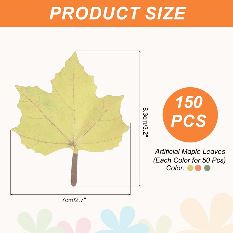 - Color: Red, Yellow, Green; Total Size: approx. 7cm x 8.3cm x 0.05cm / 2.8 x 3.3 x 0.02 Inch(L*W*T); In the package of: 150 Pack x Artificial Maple Leaves