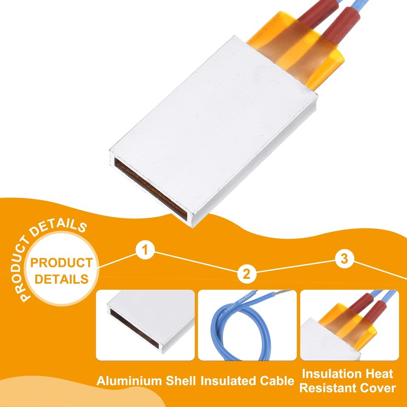 - PTC Heating Plate, is in size of: 35mm x 21mm x 5mm / 1.38-inch x 0.83-inch x 0.2-inch (L x W x H); 150mm / 5.91 inch wire length; Shell Material: Aluminium; Heating Medium: PTC Ceramic; Rated Power: 7W-150W; Rated Voltage: 220V; Rated Temperature: 150C
