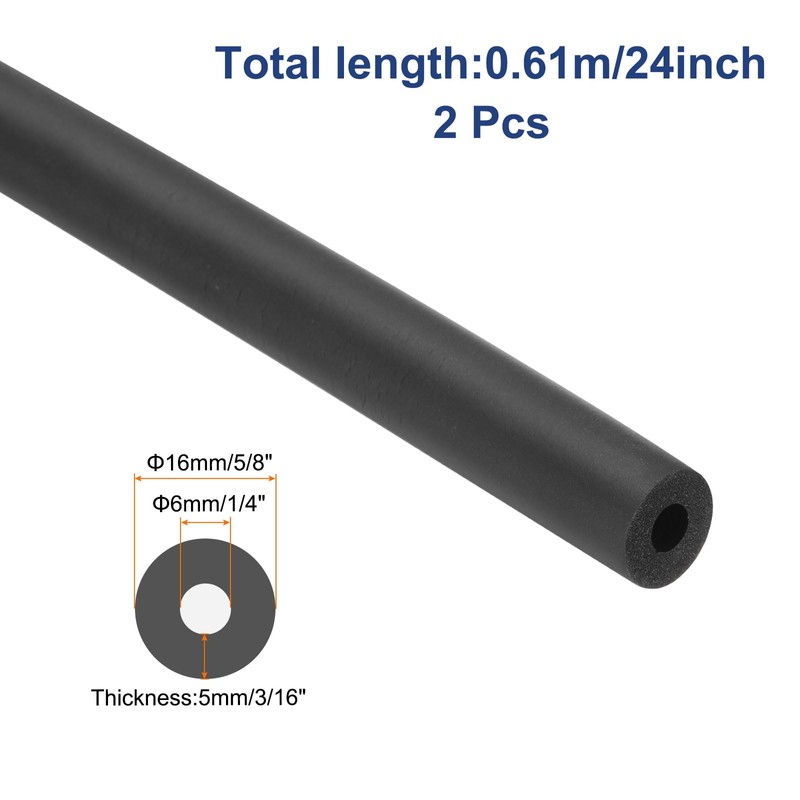 Pipe insulation foam tube, is in size of : 6mm(1/4 inch) inner dia, 16mm(5/8 inch) outer dia, 5mm(3/16 inch) wall thickness, 0.61m(24 inch) total length