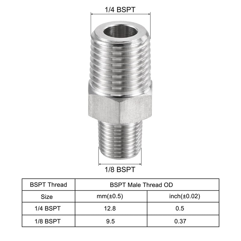 Thread Size: 1/4 BSPT to 1/8 BSPT Male