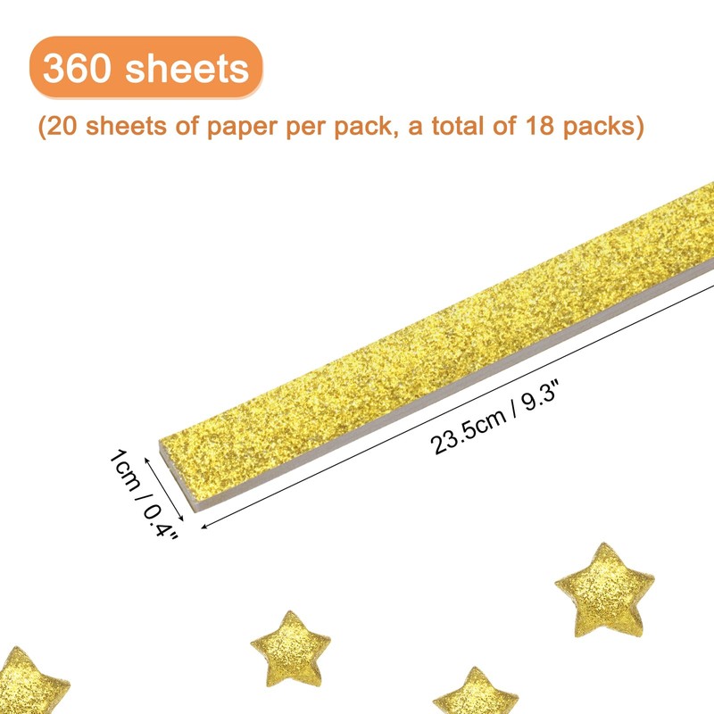 • Color: Gold, Length: 23.5cm/9.3inch, Width: 1cm/0.4inch, Material: Paper, Package includes: 360 x origami papers (20 sheets of paper per pack, a total of 18 packs)