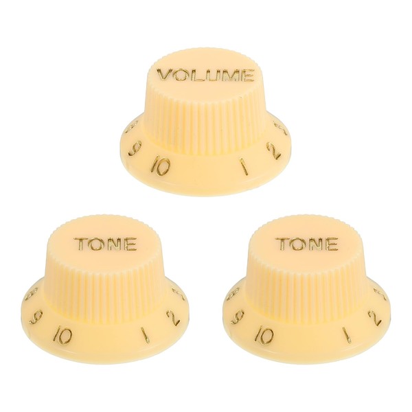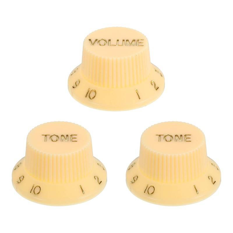 - Speed Control Knobs; Color:Cream white Gold; Material:Plastic; Size:25.5x17.5x13.5mm/1x0.69x0.53 inch(IDxODxH); In the package: 3pcs x Volume Tone Guitar Knobs(1 Volume 2 Tone)