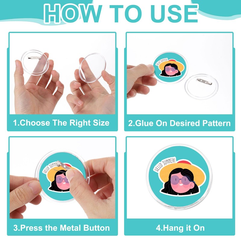 - 1. Choose the desired size and stick the desired pattern or photo onto the clear button pin 2. Ensure that the pattern is flat, centered, and firmly attached to the product 3. Thread the metal pin part through clothing or other items you want to secure, and then tie it on.