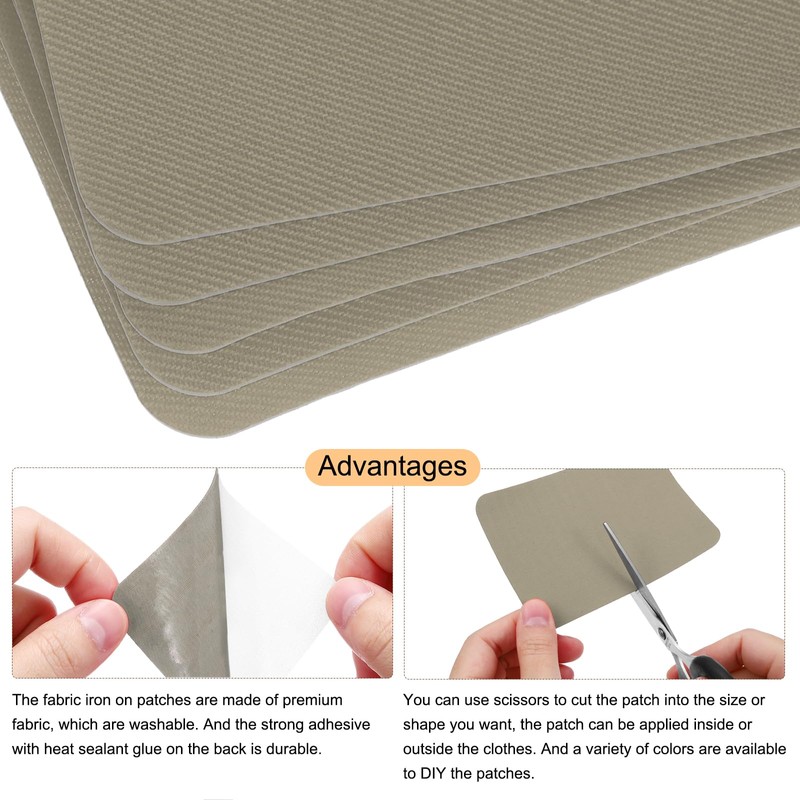 - The iron on patches, we provide here, are in the size of: Total Length: approx. 10.5 cm/4"; Total Width: approx. 7.5 cm/3"; Material: Fabric; Color: Khaki; In the package of: 6 Pcs x Iron on Patches