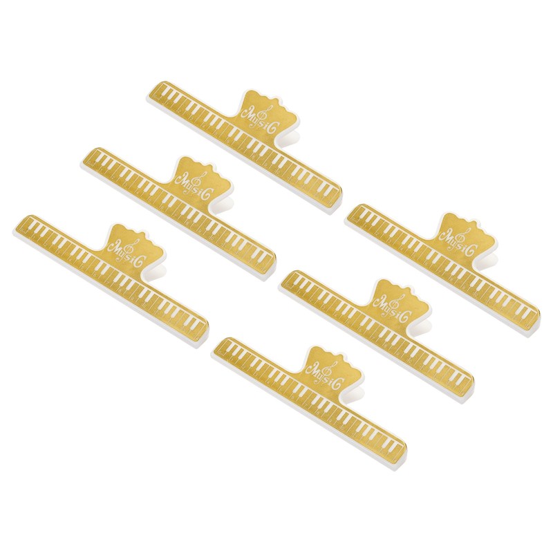 - Total Size: 150 × 50mm / 5.91 × 1.97"; Opening Width: 16mm / 0.63"; Material: ABS; Color: Gold Tone; In the package of: 6pcs x Sheet Music Clips