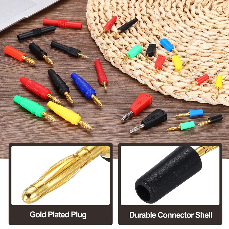 - Banana Plugs Connectors: Size: 6 x 26.5 mm / 0.24 x 1.04 inch (OD x L); Material: Copper; PE; Current Capacity: 10A; Connector Size: 2mm (OD); Color: Black;