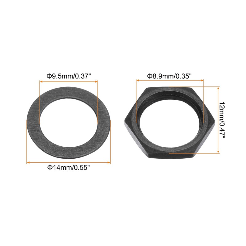 - Guitar nut, is in size of : 12mm x 8.9mm x 2mm/0.47-inch x 0.35-inch x 0.08-inch(Hex opposite side width*Inner dia*Thickness), Guitar washers, is in size of : 9.5mm x 14mm/0.37-inch x 0.55-inch(Inner Dia*Outer Dia)
