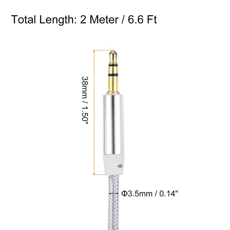 - TRS: 3 Pole; Color: Silver; Wire Diameter: 3.5mm / 0.14"; Total Length: 2 Meter / 6.6 Ft; Plug: 3.5mm x 38mm / 0.14" x 1.50" (D*L).