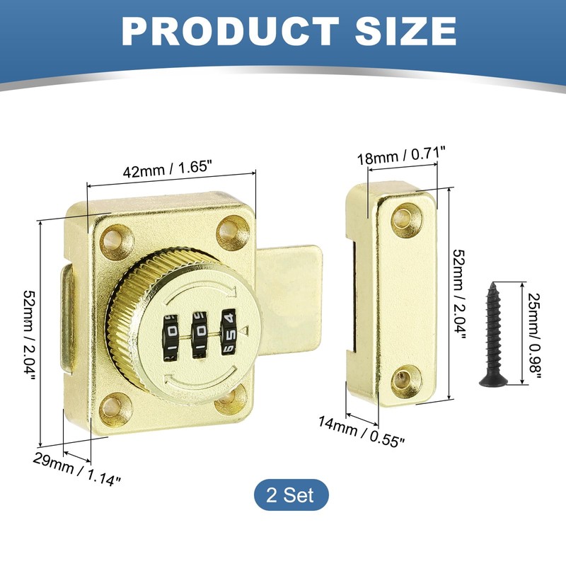 - The Combination Password Lock We Provide: Size of part 1: 52 x 42 x 29 mm/2.05 x 1.65 x 1.14 Inch; Size of part 2: 52 x 18 x 14 mm/2.05 x 0.71 x 0.55 Inch; Length of Screws: 25 mm/0.98 Inch; Color: Gold; Material: Zinc Alloy; Package: 2 Pcs x Lock + 12 Pcs x Screws + 2 Pcs x Password Pin