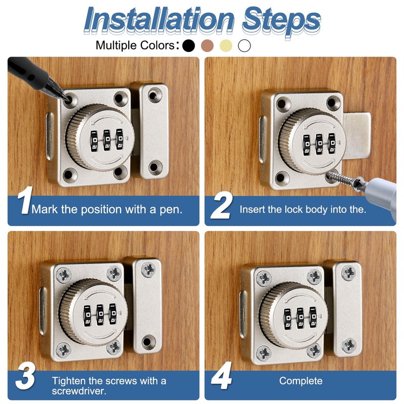 - Steps of installation: 1, Create holes for the lock's mounting screws. 2, Securely attach the mounting plate to the door. 3, Insert the lock body into the mounting plate. 4. Reset password(original password is 000).