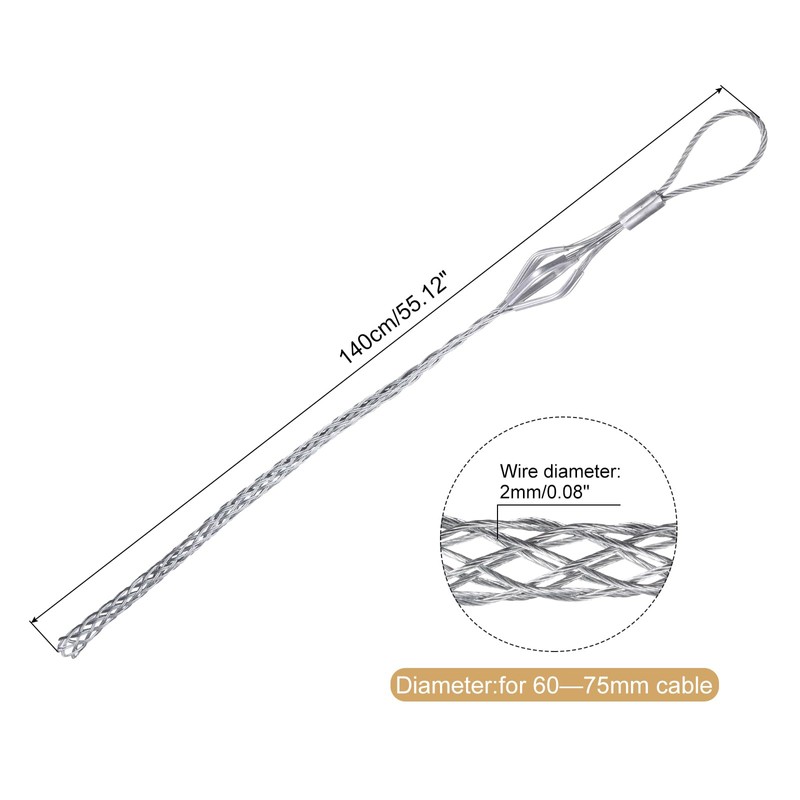 - The wire puller socks ,is in size of:Length:140cm(55.12 Inch);Wire diameter:2mm/0.08 inch;Diameter:for 60-75mm cable;Color:Silver;Material: galvanized steel;In the package of: 1 x Single Wire Mesh Puller Socks Grip;