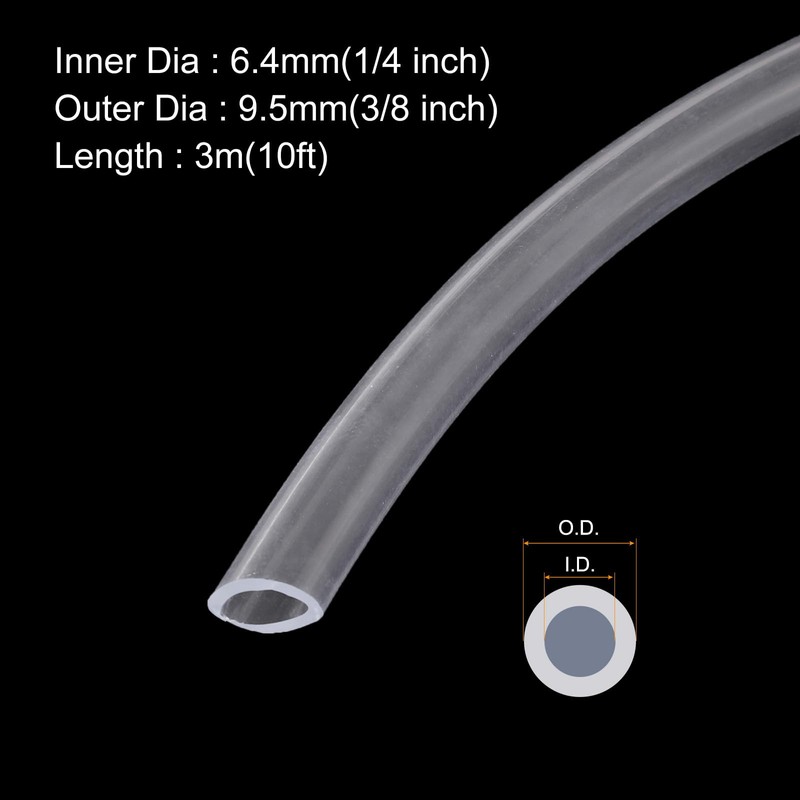 PVC Tubing, is in size of : 6.4mm(1/4 inch) inner dia, 9.5mm(3/8 inch) outer dia, 3 meter/10ft total length