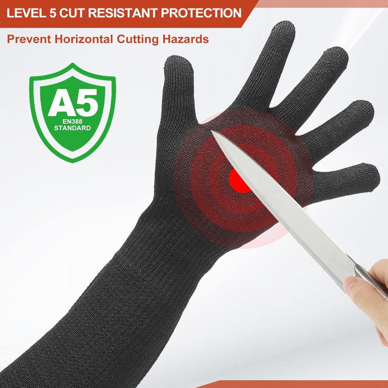 - Complete Arm Protection: The cut-resistant sleeves are designed with gloves and elastic cuffs to ensure a snug fit. These level 5 protective sleeves extend from fingers to elbows, providing comprehensive coverage to protect your arms from cuts, abrasion, scratches, oven burns, flame, and spark scald