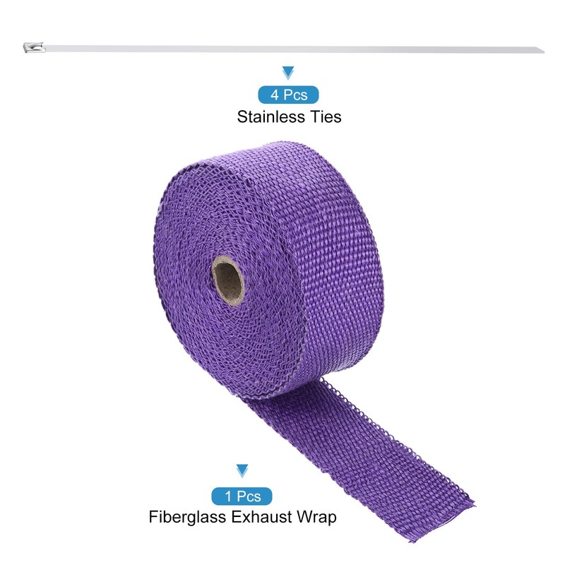 - Color: Purple, Width x Length: 2" x 33' ,Thickness: 1.5mm/0.06", Stainless Ties Length: 30cm/11.8", Packaging includes: 1xFiberglass Exhaust Wrap+4xStainless Ties